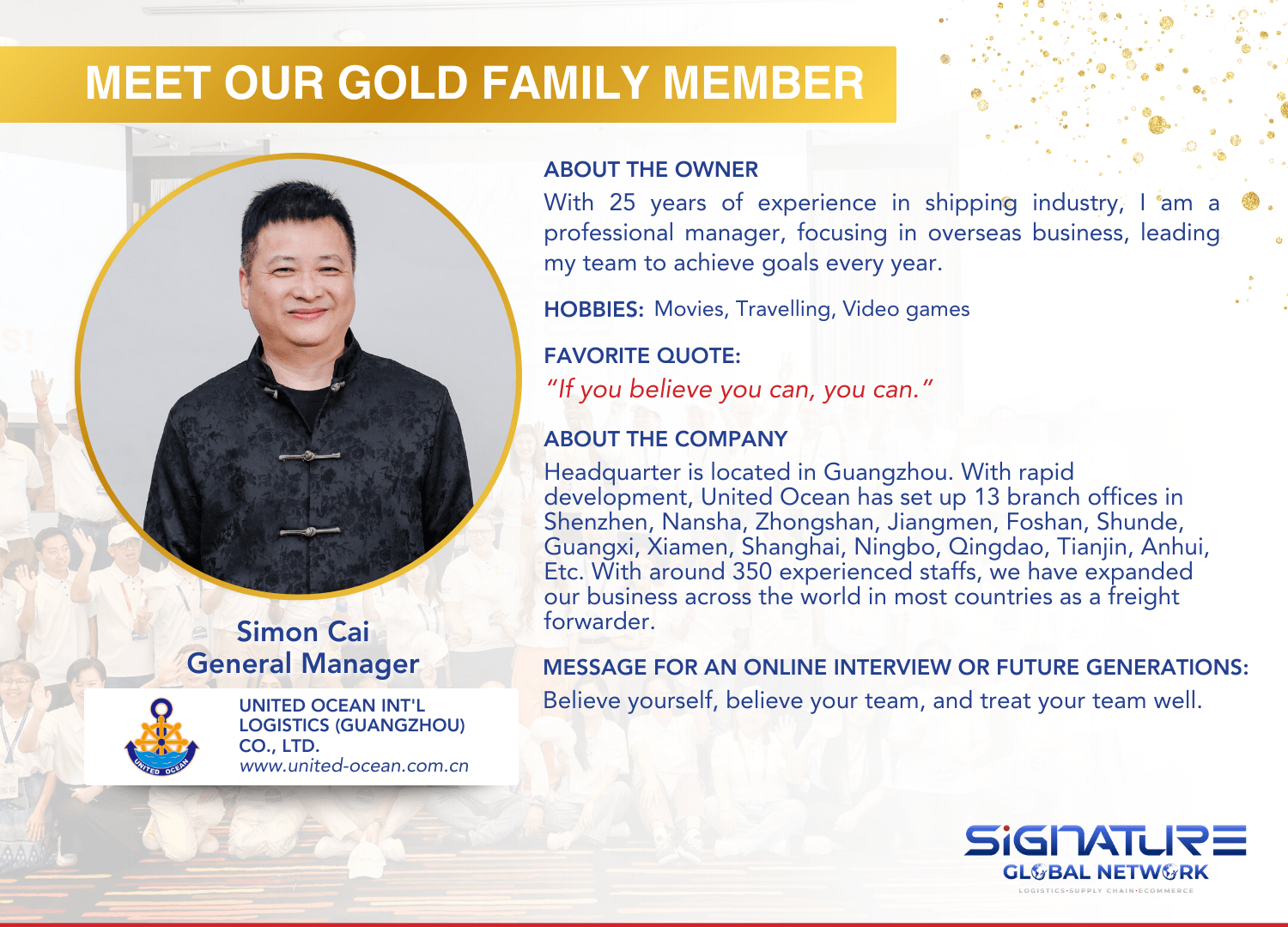 We’re excited to welcome Simon Cai of United Ocean Int’l Logistics (Guangzhou) Co., Ltd. to our logistics community! A true leader in global logistics, Simon brings expertise and innovation.